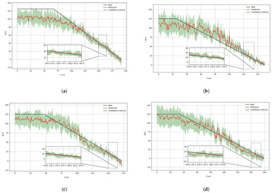 The figures show that there is great uncertainty in the initial stage. Then, the CI gradually narrows as the aero-engine degrades, and, finally, the fault interval is accurately predicted. From the partially enlarged image, it can be seen that even if the point prediction does not completely overlap with the real-life degradation curve, the CI can still provide a reliable prediction range. The same conclusion can be made from the results of other engines in the data set, which are not displayed due to the space limitation.