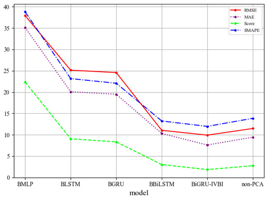To illustrate the effectiveness of the BiGRU-IVBI model in the proposed method more comprehensively, under the same network configuration conditions, we compared our model with the Bayesian multi-layer perception (BMLP), Bayesian long short-term memory (BLSTM), Bayesian gate recurrent unit (BGRU), and Bayesian bidirectional long short-term memory (BBiLSTM) models. Table 2 shows the RUL prediction results of the comparison with CI. It can be clearly seen from the data in Table 2 that our BiGRU-IVBI method has the best performance among the four models with the lowest RMSE, MAE, Score, and SMAPE. To make the results more intuitive, a line chart is also provided in Figure 10.