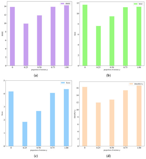 In order to illustrate the effect of the parameter in the Gaussian mixture model on the prediction performance, we also compare the experimental results of several Gaussian mixture models with different mixing ratios , and the comparison results are shown in Table 5 and Figure 12. In order to ensure the fairness of the experiment, the average value of five experiments is taken for all of the above test data.