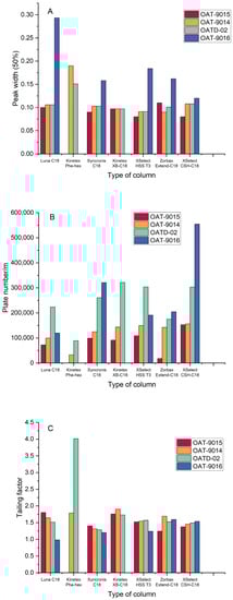 - Kadlecová, Z.; Kalíková, K.; Ansorge, M.; Gilar, M.; Tesařová, E. The effect of particle and ligand types on retention and peak shape in liquid chromatography. Microchem. J. 2020, 159, 105466. [Google Scholar] [CrossRef]