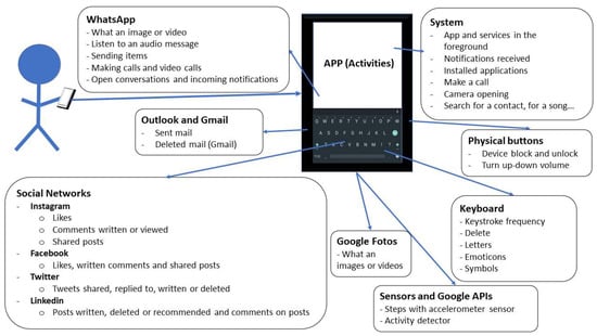 The overall context of the M4S project presented above is described in Figure 1. This work contributes to the characterization of the interactions with mobile devices. In the previous work [], the cognitive load of each task with the mobile device was studied to select the tasks to be considered in the present study. In parallel, a detailed analysis of gait variables while interacting with the mobile device was carried out using body tracking technology []. The protocol employed within the experiment can be summarized as follows: (1) all participants were informed and signed the consent form; (2) the participants, with or without help, installed BIPapp (described in Section 3.2) and configured it to activate the required permissions and services (i.e., accessibility and activity recognition services); (3) without receiving any additional instruction, they used their mobile devices for at least 7 days; and (4) users uninstalled BIPapp from their devices.