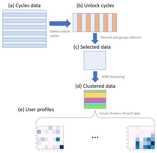 Before applying the algorithm, the data are pre-processed in two ways. First, a logarithm is applied to the duration column, so that its distribution is similar to a Gaussian function, and its large scale has less impact on the clustering. Second, all the data are standardized using Z-score normalization, causing all of them to have the same scale, which is highly desirable for a clustering process. Once the clustering process is completed, the next step is to study each group of cycles by observing their distributions and the means, medians, and standard deviations of the different features. Lastly, profiles are built by counting the number of cycles of each type for each user. This process is illustrated in Figure 4.