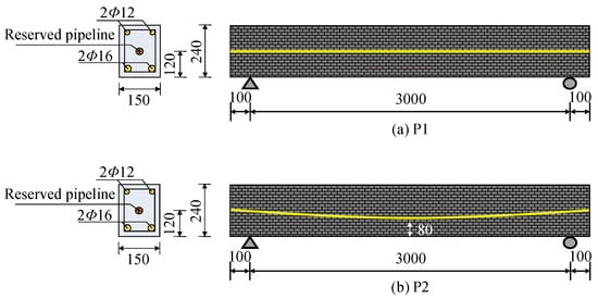 Three rectangular reinforced concrete beams were labeled as P1, P2, and P3. They were designed following the principles of concrete structural design. P1 is an ordinary reinforced concrete beam. P2 and P3 are curved reinforced concrete beams with prestressing applied using the post-tensioning method. The magnitude of the applied prestressing force is 120 kN. The reinforcement arrangement, excluding the prestressing bars, is the same for all beams. A low-relaxation 7Φs5 steel strand with a cross-sectional area of 139 mm2 was selected as the prestressing reinforcement for beams P2 and P3. The upper reinforcement in all three test beams consists of 2Φ12 steel bars. The lower longitudinal tensile reinforcement comprises 2Φ16 steel bars, resulting in a reinforcement ratio of 1.046%. The stirrups used are R235 grade steel, and the remaining hot-rolled ribbed steel bars are HRB335 grade. Ordinary 42.5R grade cement was used for the entire construction. Hinged supports were employed at both ends of the beams for the experiments. Detailed parameters for the simply supported beams are provided in Table 1, and the construction is illustrated in Figure 1.