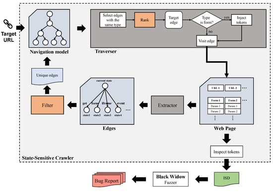 SSBW is divided into two modules: crawler and fuzzer. The input of the crawler is the URL of the website to be tested. First, an empty node and the URL is constructed to an initial edge, which is the original navigation model graph. Next, we select the only edge of the graph to visit and get the web page corresponding to the initial URL. The web page contains a variety of elements that may find the new state, i.e., GET requests, form submissions, iframes, JavaScript events [8]. The methods for transformation between states are categorized into “get”, “form”, “iframe”, and “event”. Thus, an association relationship between the current state (that is, the web page visited by the initial URL) and the elements in the page that may reach new states can be built. Each association relationship is a new edge, the starting node of the edge is the current state, the end node of the edge is the new state that may be reached, and the information required for the transition between the states is recorded. To improve the efficiency of the crawler, it is necessary to delete similar edges (introduced in Section 3.2.4) among all the new edges, in order to avoid repeated visits to the same page or similar forms. Finally, the filtered unique edges are added to the navigation model to create a new navigation model. There are many edges in the new navigation model graph. In order to achieve a balance between the coverage of injection points and the exploration of new states, a proper traversal strategy is required for determining which edge to visit next. We designed different ranking methods for edges with different transformation methods. For edges with a transformation method of “form”, their visit order determines the order of fuzzing. Therefore, we believe that their ranking methods play a crucial role in vulnerability detection. The parts of Crawler are detailed in Section 3.2.