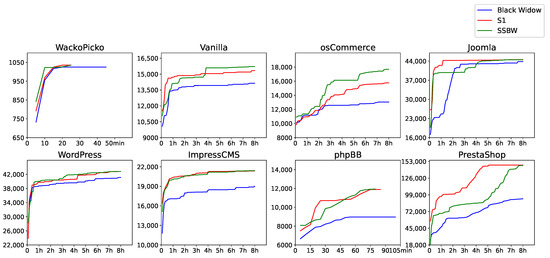 To further explore the effectiveness of the filtering method in reducing visiting similar states during the scanning process, Figure 2 depicts the temporal evolution of code coverage. At the same time of execution, both SSBW and S1 can almost have higher code coverage than Black Widow. We believe that this is a positive effect of filtering similar states. Sometimes the code coverage of SSBW is lower than that of Black Widow (e.g., during the 2–4 h period of Joomla). We believe this is because SSBW spends the necessary fuzzing time on forms with more input parameters.