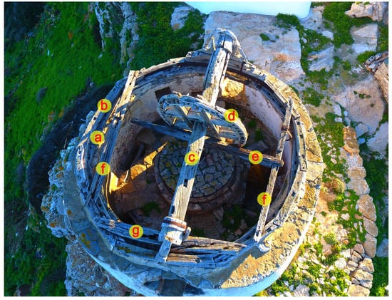 - Tapanli-Dania, M.; Malakos, G.; Diagouma, A. Restoration of a windmill in Perama, Lesvos. In Proceedings of the 2nd National Conference “Mild Interventions for the Protection of Historic Structures”, Thessaloniki, Greece, 14–16 October 2004; Thessaloniki, TEE and Ephorate of Newer Monuments of Central Macedonia. Volume 2, pp. 91–101. [Google Scholar]
