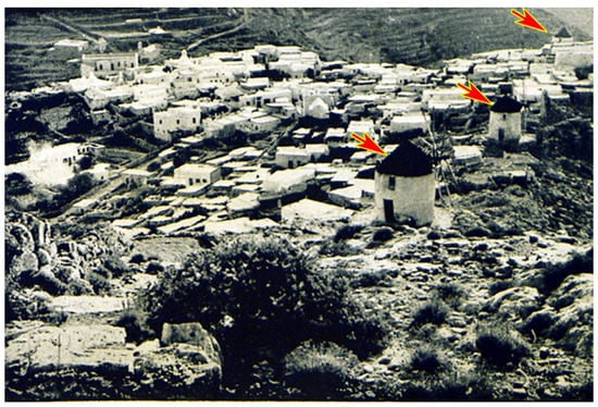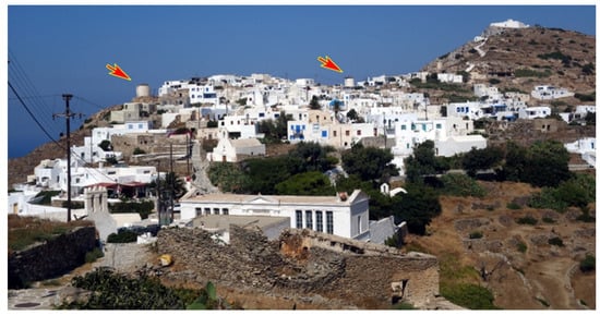 In the “Kastro” district, at the steep northern edge of Sikinos Chora (main town), three abandoned windmills (Figure 2) are preserved today, one of which, in the northeast, is partially demolished. According to Vaos and Nomikos [3], there were six windmills in Chora (Figure 3).