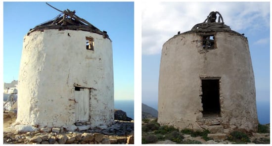 The mechanisms are being preserved today only in the two most western-located windmills (Figure 5), as the wooden part has been completely removed and destroyed in the one located further east. Both windmills that retained the wooden mechanism nowadays are of the vertical single-floor type, with a rotating roof (“trula”), which allows for the main mechanism to be repositioned so that the mill can operate with all wind directions, although they no longer include the external conversion frame of wind power in motion through sails. One of them, in the north–northeast side of Chora, was in operation until 1977 and is considered to be in a relatively good condition, retaining part of the conical roof, while it remains locked by its owners.