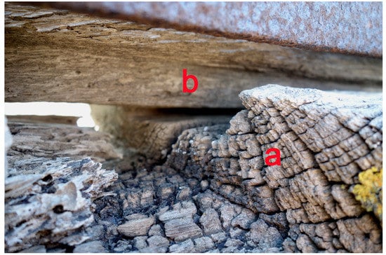 As it appears from the limited oral testimonies of elderly residents, no means were used in the past to protect these wooden parts that have survived biological attacks, although in the literature, there is a reference to the initial protection of the shaft via a burning–smoking process, which was later replaced by the use of pine tar [3]. Of course, parts of the studied windmill mechanism (mainly “violas”, cogs, “pentaravda” and “panarika”) had been regularly smeared with grease or soapy water, which, however, did not aim to protect against biological attacks, but facilitate the rotational movement and the subsequent damage reduction.