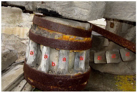 On the contrary, for the construction of the wheel, with the exception of the cogs, the wood of plane, elm and chestnut were used [22], with the plane and elm being mainly of medium weight (0.60–0.72 g/cm3 and 0.46–0.70 g/cm3, respectively) and hardness, while the chestnut shows a low-to-medium weight (0.37–0.70 g/cm3) and low-to-medium hardness [22].