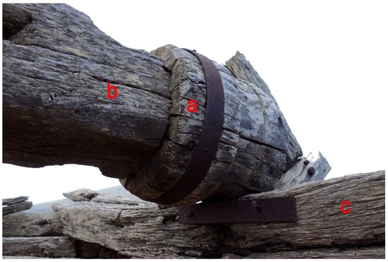 On the contrary, in the rotation and orientation system of the “fteroti” (“panarika”, “katoplakes”), many individual pieces were used that created an almost polygonal structure in places, thus limiting the necessity of using already curved elements. The choice of hardwood species for specific components, attributed to their great ease of bending, is also reinforced by the fact that softwood species that are difficult to be bent were not used, despite their high strength in combination with their relatively low weight (like fir wood presenting a density of 0.44 g/cm3) [22] (p. 111), although the reduction in weight of the overall mechanism was obviously desired, aiming to make it easier to operate. The same conclusion can be drawn from the use of elm species in the aforementioned individual parts of the windmill mechanism studied on the island of Ios [15]. Of course, the availability of various wood species seems to have been a decisive factor that forced the use of the same species in several individual sections, where possible, based on the properties that each application required, depending on the use–location of the windmill mechanism. This also proves the thorough empirical knowledge of each wood species property. Additionally, it should be noted that some of these components might have been replaced over the windmills’ long service lifespan using any wood species available at that period.