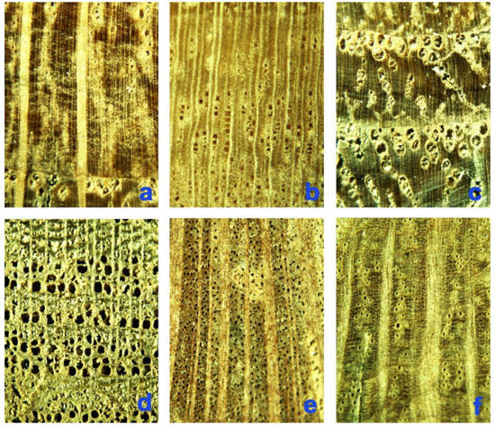 Wood species used in the windmill mechanism on Sikinos ((a). red oak (Quercus sp.), (b). olive (Olea Eurepaea), (c). chestnut (Castanea sativa), (d). elm (Ulmus sp.), (e). plane (Platanus sp.), (f). holm oak (Quercus ilex)) (stereomicroscope 16×, Nikon SMZ800).