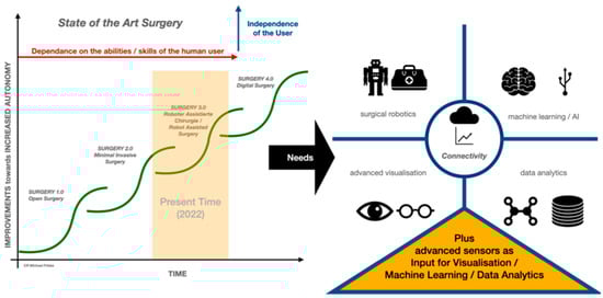 Figure 2 shows a vision of what might happen to minimally invasive and image-guided surgery with the integration of advanced sensors and visualisation, machine learning, and data analytics. The independence on the abilities and skills of the individual user will eventually be eliminated, solving a huge education and, subsequently, availability problem [,,,].