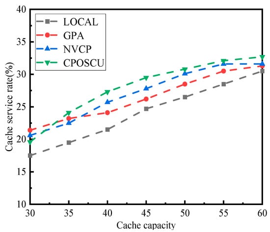 To evaluate the impact of different cache capacities on the algorithm’s performance, the cache capacity of each server was set to vary between 30 and 60 data blocks. A total of 200 tasks were simulated to be executed by users. The impact of different cache capacities on the cache service rate generated by the four algorithms is shown in Figure 4.