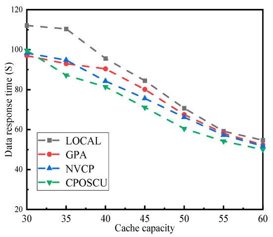 The experimental results of four algorithms for data response time with varying storage capacities is given in Figure 5. The figure indicates that when the cache capacity is 50, the CPOSCU algorithm reduces the data response time by 14.43%, 10.37%, and 8.61% compared to the LOCAL, GPA, and NVCP algorithms. While the value of the cache capacity is 55, the data response time, respectively, decreases by 8.45%, 6.87%, and 5.41%.