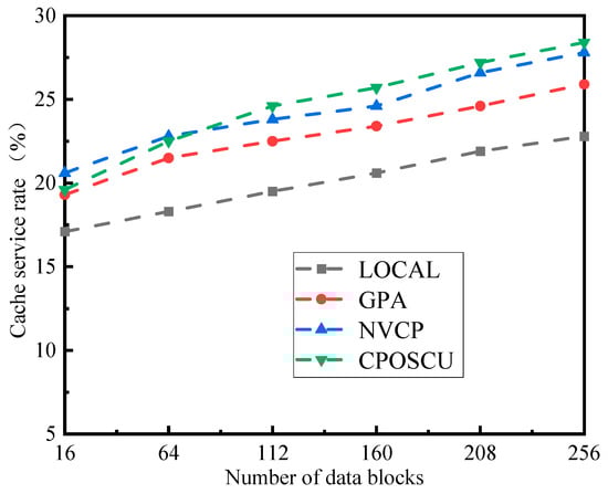 To evaluate the impact of different numbers of data blocks required on the algorithm’s performance, the number of data blocks was set to vary in the range of 16~256. The cache service rate of the four algorithms with different numbers of data blocks is outlined in Figure 7.
