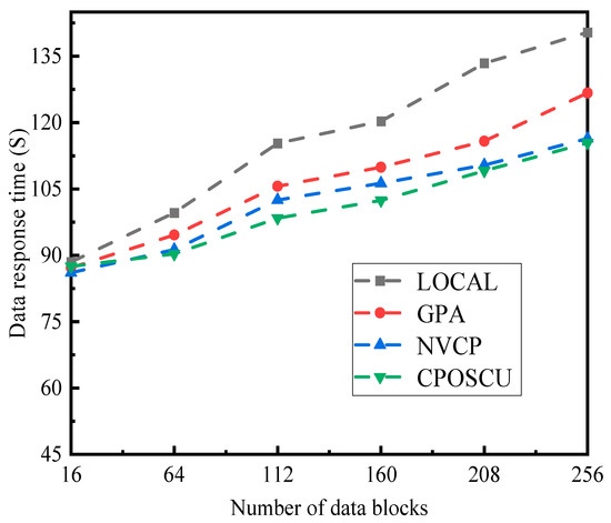 The performance comparison experimental results of data response time among the four algorithms under the range of required data block numbers is demonstrated in Figure 8. The data response time of each algorithm rises with the increasing number of required data blocks, while the data response time of the CPOSCU algorithm is the lowest and the data response time of the LOCAL algorithm is the highest. Owing to this, the LOCAL algorithm prioritizes placing data with a high cache value on servers with a low replacement rate, but the CPOSCU algorithm effectively improves the data hit rates while also ensuring data stability.