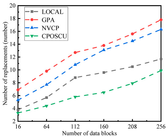 The impact of replacement numbers under the range of required data block numbers is illustrated in Figure 9. The replacement rates of the four algorithms increase as the quantity of the required data blocks increases. However, when the quantity of required data blocks is small, the difference in the number of replacements between the CPOSCU algorithm and the LOCAL algorithm is not much different, mainly because the LOCAL algorithm considers the cache ratio of available space, and the CPOSCU algorithm also considers the cache space and replacement cost; however, when the number of data blocks is large, the CPOSCU algorithm has the lowest replacement number.