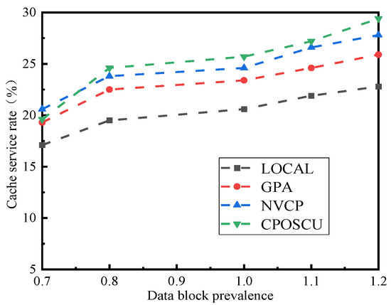 To evaluate the impact of different data block popularities on the algorithmic performance, the range of data block popularity variation was set from 0.7 to 1.2. The variation process of the cache service rate with data block popularity is reflected in Figure 10.