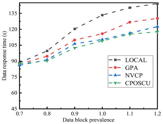 The impact of data response time on the number of data blocks is illustrated in Figure 11. This is primarily caused by the fact that the data response time decreases as the probability of a user hit increases with the increasing popularity of the data block. Furthermore, it is clear that the CPOSCU algorithm has the lowest and the LOCAL algorithm has the highest data response time. The reason is that the LOCAL algorithm is a random cache, while the CPOSCU algorithm considers the replacement rate and cost overhead of the edge server as well as the data block’s prevalence.