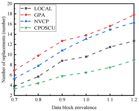 The effect of replacement numbers under the different data block’s popularity is illustrated in Figure 12. The LOCAL algorithm keeps the number of permutations stable as the popularity increases, while the GPA, NVCP, and CPOSCU algorithms decrease most significantly. This is because the LOCAL algorithm only performs random caching and has the largest number of permutations; other algorithms take into account the data popularization, which generates a reduced number of permutations, while the CPOSCU algorithm considers the server permutation rate in addition to the prevalence. Therefore, it generates the smallest number of permutations.