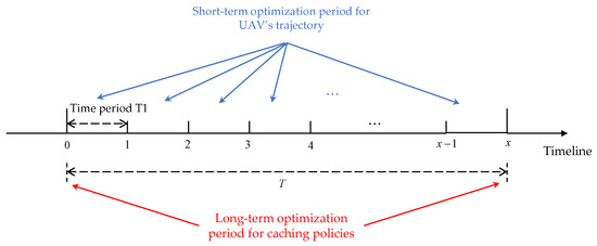 For the movement of the UAV, the road is divided into several rectangular blocks and the side length of each rectangular block is the coverage diameter of the UAV. Taking each time period Tx as a trajectory optimization cycle, the UAV stays in a block during a trajectory optimization cycle to serve the vehicle users in that block and selects an adjacent block at the end of the current trajectory optimization cycle to fly to that block in the next cycle, i.e., whenever the vehicle density changes, the UAV’s position also changes. Choosing different flight trajectories results in different gains and time delays. It is worth noting that the caching decision of frequent node replacement will incur a large overhead, so the optimization of caching decision is a long-time optimization, while the UAV has mobility and needs to plan the flight trajectory for each time slot for it, which is a short-time optimization; the relationship between the two is shown in Figure 2.