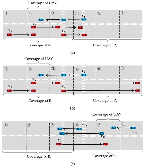 For the case where the UAV and one RSU caches and the other does not, the UAV stays on the road section where the RSU that does not cache the content is located. Take the example of caching , not caching, and the UAV staying on the side, as shown in Figure 3c. When a vehicle drives in from the side of the roadway, as in , it first acquires content from and, if it does not fully acquire content when driving out of the roadway, it continues to acquire from the UAV. When the vehicle is approaching from the -side section, if the vehicle user sends a request when it is not in the coverage area of the UAV, e.g., , it enters a wait state until it is in the coverage area and obtains from the UAV. If the vehicle user sends a request, e.g., , while in the coverage area of the UAV, it first obtains from the UAV and, if the content is still not fully obtained when driving out of the coverage area of the UAV, it enters the wait state until it drives into the side section and obtains from the . If the vehicle user sends a request, e.g., , after driving through the coverage area of the UAV, it enters the wait state until it drives into the side section and obtains from the .