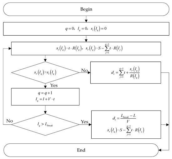 The request delay for the vehicle user consists of a waiting delay and a transmission delay with each cache node, where the waiting time is the time the vehicle user travels without a cache node transmitting content for it before the content is fully available; the transmission delay needs to be calculated based on the transmission speed. Assuming that the length of each time slot is and the size of the content to be transmitted is , which is an integer multiple of the content block size , and that the transmission link is broken at position , the calculation of the transmission delay is shown in Figure 4. Suppose the current time slot is the th time slot after starting transmission, at this time, the vehicle user’s position is , the amount of data that can be transmitted by this time slot is , the size of the data that has not been transmitted is . If , it means that the current time slot cannot complete the content delivery and the next time slot will continue the transmission. Otherwise, the current time slot can complete content delivery; the time used for data transmission in this time slot is . The content transmission ends at this time slot and the transmission delay of the vehicle user at this cache node can be expressed as