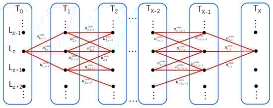 The UAV caches the contents of the RSU lease according to the prevalence, so the utility saved when the UAV is on each road block in different trajectory optimization cycles can be calculated; the utility saved when the UAV stays on road block in optimization cycle is denoted by . At this point, can be regarded as a shortest path problem and the UAV trajectory is regarded as a directed graph, as shown in Figure 5, where the point indicates that the UAV stays on the rectangular block during the optimization period . The edge connecting the two points indicates the path of the UAV and is used as the weight of the edge.