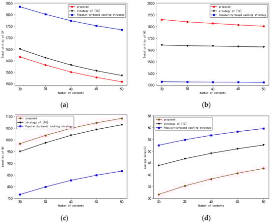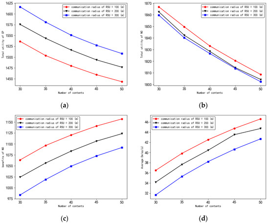 Figure 9 gives the relationship between the performance of this paper’s strategy and the communication radius of RSU for different total number of contents. From Figure 9a–d, it can be seen that the average delay, the benefit, and the total utility of NO decreases with the increase in the communication radius of RSU and the total benefit of CP increases with the increase in the communication radius of RSU. This is because, as the communication radius of the RSU increases, the success rate of the vehicle user in obtaining content from the RSU increases; then, the average request delay of the vehicle user decreases. At the same time, the demand of NO for content becomes larger and the content rental price increases; then, the total utility of CP increases and the benefit of NO decreases. The total utility of NO is determined by both the delay and the benefit of NO and, combined, it decreases slightly with the increase in RSU communication radius.