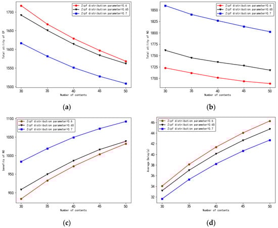 Figure 7 gives the relationship between the performance of this paper’s strategy and the Zipf distribution parameter for different total number of contents. From Figure 7b–d, it can be seen that the average delay decreases with the increase in Zipf distribution parameters when the total number of contents is constant and the benefit and total utility of NO increases with the increase in Zipf distribution parameters. This is because, as the Zipf distribution parameter increases, the requests of vehicle users become more and more concentrated on the content with high popularity, so the cache hit rate increases, the request latency of vehicles becomes smaller, and the success rate of vehicles to successfully obtain the content becomes larger. As the cache hit rate increases, the benefit and total utility of NO increases. From Figure 7a, the average delay decreases as the Zipf distribution parameter increases when the total number of contents is constant. This is because, as the Zipf distribution parameter increases, the request rate of vehicle users for content with low popularity decreases, which will lead to a lower degree of demand for these contents by NO, so the content rental price decreases and the total utility of CP decreases accordingly.
