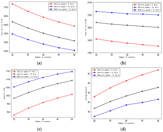 Figure 8 gives the relationship between the performance of this paper’s strategy and the vehicle speed for different total number of contents. From Figure 8a–d, it can be seen that the average delay decreases with the increase in vehicle speed, the benefit and total utility of NO increases with the increase in vehicle speed, and the total benefit of CP decreases with the increase in vehicle speed. This is because, as vehicle speed increases, the time vehicle users spend traveling on the roadway becomes shorter, the maximum waiting delay becomes shorter, and the average delay decreases. As the vehicle travel speed increases, the contact time between the vehicle and each cache node decreases, and the success rate of content delivery decreases, so the degree of demand for content by NO decreases and the content rental price decreases, resulting in a decrease in the total utility of CP and an increase in the benefits and total utility of NO.