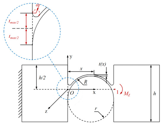 To our knowledge, the shape of the flexure hinge can guide its motion. There are a lot of FCMs designed by using the specified shape flexure hinges. Some researchers have proposed a variety of notch flexure hinges with different shapes. For instance, slender beam, corner-filleted, circular, elliptical, and V-shape [8,9,10,11,12]. These types of flexure hinges can implement rotation motion with the inner center due to their constant and symmetrical sections. However, such kinds of shapes in the cross-section cannot lead to an off-rotational center. The semi-circular notch flexure hinge, as shown in Figure 1, is a typically shaped flexure hinge that can guide a circle motion with a remote rotation center. It is widely utilized in exoskeletons, prosthetics, and so on [13,14].