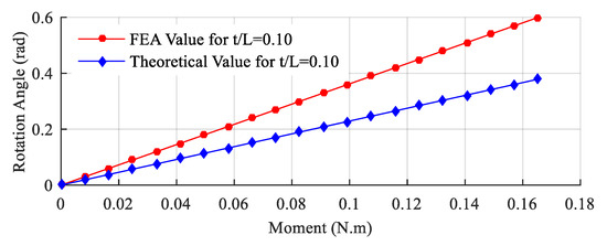 A given model is built to verify the accuracy of the compliance matrix based on Castigliano’s second theorem under large deformation, and the results obtained from Equation (5) were compared with the finite element analysis (FEA) results. The different rotation angles obtained from the FEA results and Equation (5) under the same moment are shown in Figure 3.