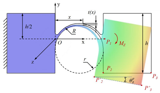 The structure model of the variable cross-section semi-circular notch flexure hinge is shown in Figure 2, while the radii of the two concentric circles are R and r, respectively. As is shown in Figure 1, L, w, and t denote the length, width, and minimum thickness of the hinge, respectively, and h represents the height of the rigid body. In general, the ratio of t/L is defined as the dimensionless design parameter to describe the geometry characteristics of the hinge. As a special variable cross-section flexure hinge, the inner circle of the hinge is always tangent to the two rigid bodies under the different value of t/L, and it can be deduced that L = 2r. Two fillets are designed at both sides of the hinge to reduce stress concentration. The fillet is tangent to the outer circle and rigid body with a radius of a. The origin of the coordinate system is the midpoint of the line that connects the two tangent points of the fillets and the inner circle. For the human finger, the joints are driven by the muscle and the moment is generated at each joint. Therefore, one end of the flexure hinge is fixed, and a moment is given at point ‘1’ of the other free end. Compared with many other semi-circular notch flexure hinges with a constant cross-section, both sides of the hinge proposed in this paper are thicker than the middle part. This kind of flexure hinge also shows good motion accuracy and better energy storage characteristics because of its geometrical characteristics.