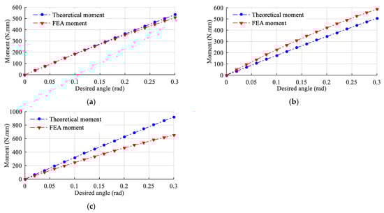 Schemes follow another format. Theoretical moment and FEA moment; (a) model designed by the general design equations; (b) model designed by the Howel’s equations; (c) model designed by the Lobontiu’s equations.