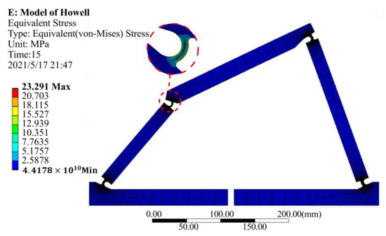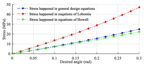 and denote the theoretical moment obtained from Howell and Lobontiu’s equations, while and denote the corresponding FEA output results. The theoretical moment and the FEA moment are plotted in Figure 8. The stress distribution figure of the model obtained from the equations proposed by Howell is shown in Figure 9 while the maximum stress is 23.291 MPa. The corresponding stress of the three models is shown in Figure 10. The errors and between and of the two mechanisms are compared with the . These errors are printed in the Figure 11.