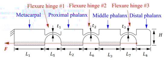 Three semi-circular notch flexure hinges are utilized in the model acting as the three joints of the finger. Specifically, in this study, we determined the overall length and height of the artificial hand by considering the dimensions and grasping capabilities of the Chinese human hand. Additionally, we established the length of each hinge based on both its height and maximum rotation angel. The two-dimensional diagram is shown in Figure 13. The metacarpal is fixed, the geometric parameters of the finger and the semi-circular flexure hinge are determined by the physiological structure of the human finger. The rotation angle of the finger is given in advance. The parameters of the finger are shown in Table 7. The minimum thicknesses of the three flexure hinges are determined so that their rotation angles are consistent with those of the human fingers. In addition, the force is applied to the finger in order to bend the finger.