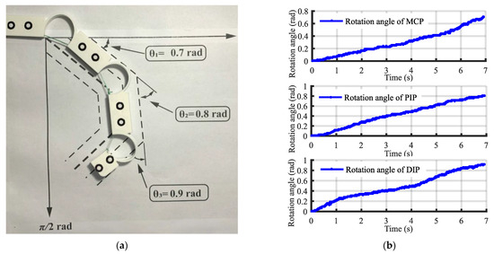 Measure results of the prototype; (a) picture of prototype evaluation experiment; (b) rotation angle of MCP, PIP, and DIP.