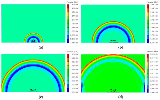 Contours of plasma explosion pressure at different moments: (a) 0.05 ms; (b) 0.15 ms; (c) 0.25 ms; (d) 0.3 ms.