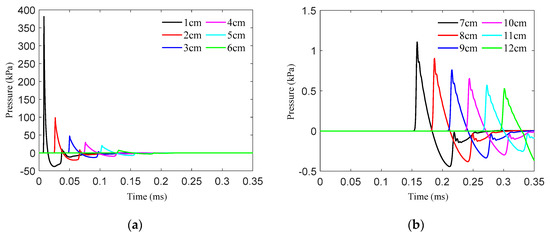 Pressure waveforms of different monitoring points: (a) points 1−6; (b) points 7−12.