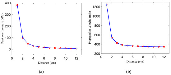 The variation of peak overpressure and shock wave propagation velocity with distance: (a) Peak overpressure; (b) Propagation velocity.
