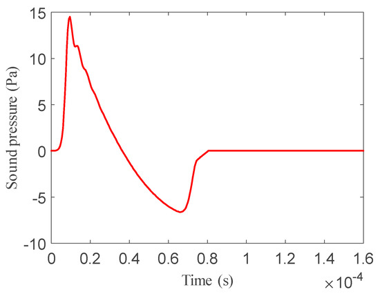 The velocity of the plasma explosion shock wave is close to the speed of sound in the later stage of propagation, and the pressure waveform of the shock wave can be equivalent to the sound pressure. Since most of the energy injected into the plasma channel is used to maintain the occurrence of the corona, generating light and heat, only a small part of it can be converted into acoustic wave energy. In addition, the real air is not ideal gas, and the wave will be partially absorbed by air during propagation. Therefore, the sound pressure conversion efficiency needs to be set to simulate the actual sound source pressure. This paper selects the shock wave pressure waveform at a distance of 10 cm from the plasma explosion point, and it sets the efficiency of converting shock wave pressure to sound pressure to 3%. The time-domain sound pressure waveform of the sound source is obtained in Figure 14.