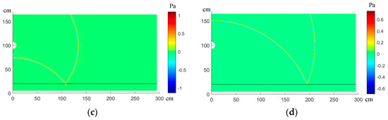 The parameters of the acoustic field are as follows: the ambient temperature is 20 °C, the air humidity is 50%, the density of air is 1.2 kg/m3, the concrete density is 2300 kg/m3, the sound velocity in air is 343 m/s, and the sound velocity in concrete is 3000 m/s. The sound pressure distribution result at different times is shown in Figure 15. It can be seen that sound waves expand outward in the form of spherical waves, and the amplitude of pressure decreases gradually. When sound waves reach the ground, only a small portion of them pass through the concrete, and most of them are reflected back into the air. The reflection of sound waves is related to the density and sound velocity of materials on both sides of the material interface. The density and sound velocity of concrete are much higher than that of air, and the reflection coefficient is close to 1. Therefore, sound waves undergo reflection at the ground and continue to propagate back into the air.