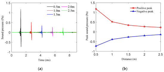 Figure 16a shows the changes in the first sound pressure waveform received at five monitoring points. It can be seen that as the sound wave moves away from the source, the attenuation amplitude gradually slows down. The sound wave decays by 56% from 0.5 to 1 m, while there is only 16% attenuation from 2 to 2.5 m. The changes in the amplitude of pressure reflect the attenuation characteristics of sound waves in space. The changes in the positive and negative peaks of sound pressure with propagation distance are shown in Figure 16b. It can be seen that the positive peak value is always greater than the negative, and the absolute ratio of the two changes is between 1.3 and 1.6. When the wave transforms from the expansion state of the positive half wave to the compression state, it is affected by the viscosity of the air; therefore, the negative half-peak value is lower.