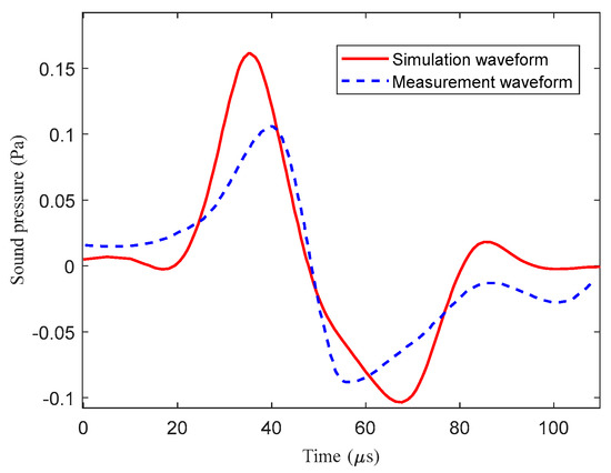 Comparison of the simulation and the measurement results of the time−domain waveform of the sound pressure.