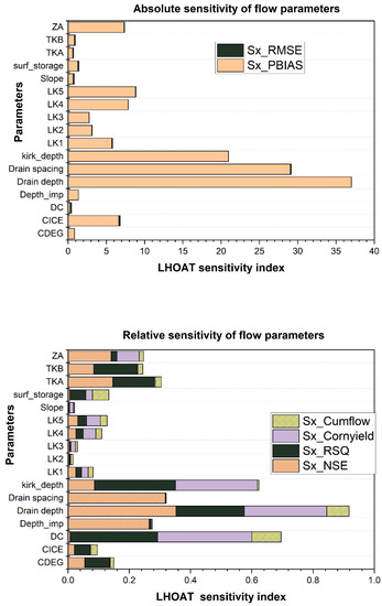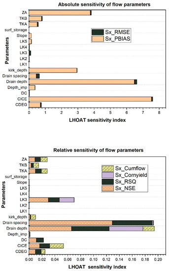 Figure 6 and Figure 7 summarize the LH-OAT sensitivity index value of DRAINMOD hydrologic parameters for CS-3 and CS-4, respectively. RMSE and PBIAS are represented by the absolute sensitivity index, while the relative sensitivity index characterizes NSE, RSQ relative yield, and cumulative flow. It is because the values of RMSE and PBIAS are zero at base simulation, which cannot represent the actual relative sensitivity of each parameter since the ratio of change in model output per change in parameters input would always be constant, whatever the parameters be. In both figures, the sensitivity of PBIAS appears more dominating than RMSE. The dominating magnitude is because of the higher absolute values of PBIAS than RMSE. However, the relative sensitivity characteristics can depict the comparative evaluation of the model output’s behavior. Most RSI values were higher for daily flow indicators (NSE and RSQ) than the water balance indicator (cumulative flow) in both fields. It represents the lower agreement of the daily flow between the base and simulated values than the long-term water balance by varying parameters in each model run.