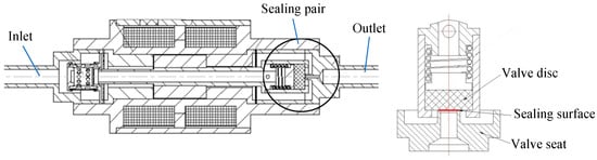 The electric valves in space propulsion systems are divided into solenoid valves, self-locking valves, proportional valves, etc., based on their functions. Most of them are solenoid axial flow structures with a compact structure and high accuracy [3,4]. The overall weight of some products is only a few tens of grams. A schematic diagram of the composition and structure of a typical electric valve is shown in Figure 1.