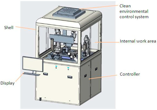 The adopted structure of the automatic assembly production line is a modular design, including an enclosure, display, clean environment control system, electrical control system, and internal work area, as shown in Figure 2. The clean environment control system is integrated on the top of the housing, and its function is to provide positive-pressure filtration for the interior during the operation of the equipment to ensure that the product operation is carried out in a clean environment. The internal work area actuator of the automatic assembly production line is shown in Figure 3, and the design of the internal work area is shown in Figure 4.