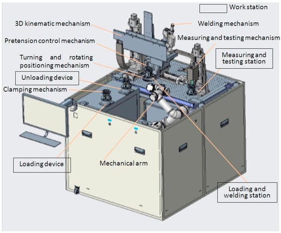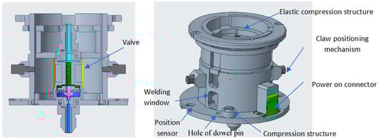 After the assembly of the valve parts, they are fixed inside the clamping structure. The entire process requires their coordination in terms of positioning and transportation between the four workstations (see Figure 4). The clamping structure integrates multiple interfaces, taking into account the functions of valve component assembly fixation, transfer interface, force load pre-tightening, fixation, welding positioning, and electrical connection. Its structure is shown in Figure 5.